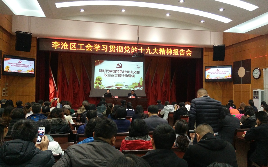 11月29日,李沧区工会学习贯彻党的十九大精神报告会在区政府7号楼小礼堂举行,区委学习贯彻党的十九大精神宣讲团成员、区委党校老师钟华作了专题辅导。区总工会和各区直工会全体工作人员,部分企业工会主席、一线职工和劳模代表共130余人参加了报告会。
