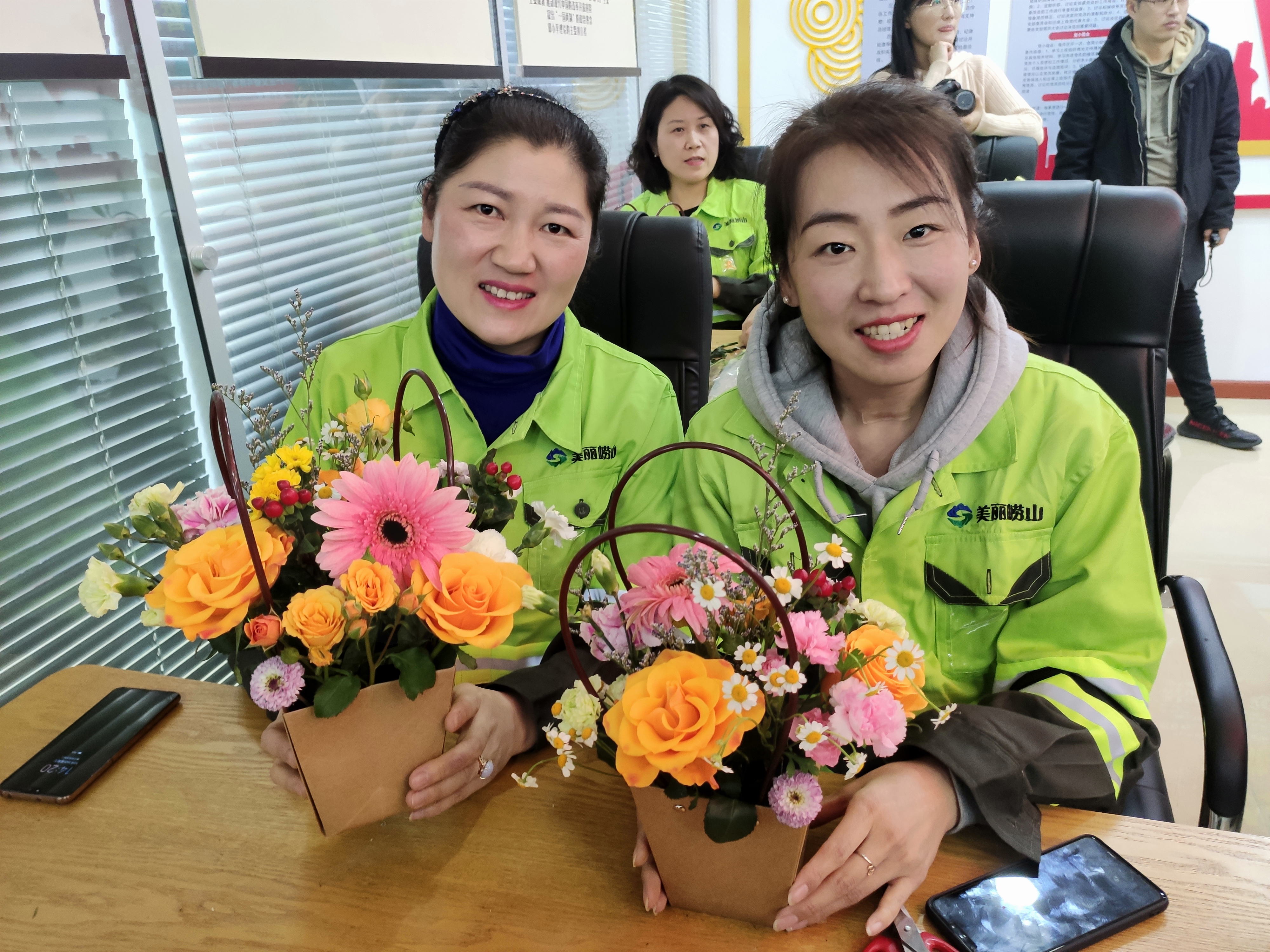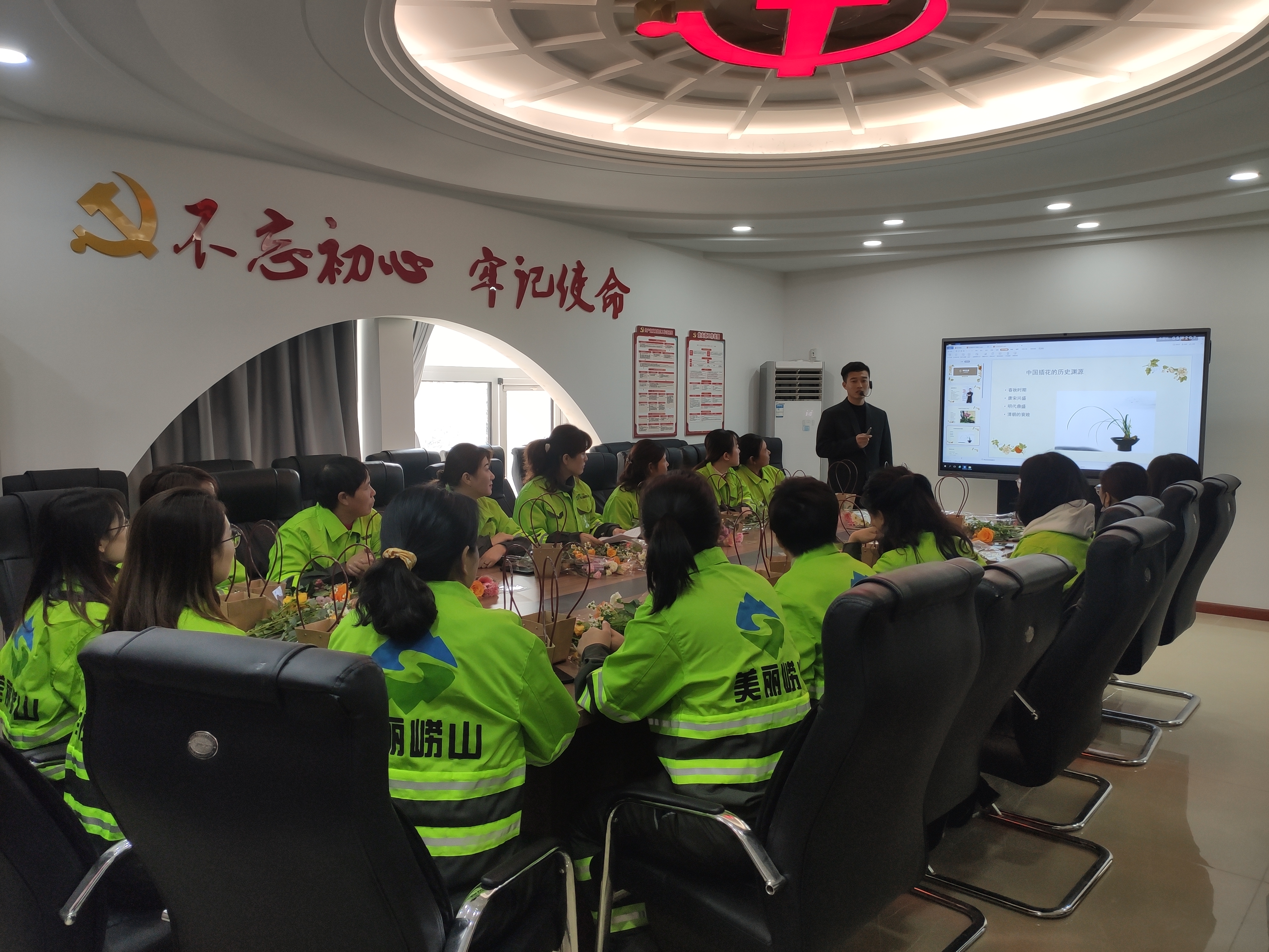 宣讲结束后,现场还为环卫一线女职工送上陶冶情操的“插花”艺术大餐。插花老师向女职工们详细传授了插花艺术和技艺,对花卉的品种、特性、花语,以及不同的插花手法、花卉色彩搭配等基本技巧进行现场演示指导,手把手指导女职工插花。本次插花培训,使环卫女职工们暂别繁忙工作、感受花艺魅力、体会自然芬芳。大家挑选着自己喜欢的花色,认真地修剪枝叶、设计造型,发挥自己的创意想象。经过1小时的精心修剪和巧妙组合,大家用灵巧的双手,将清雅别致的花篮作品完美的展现出来,脸上都洋溢着喜悦的笑容。