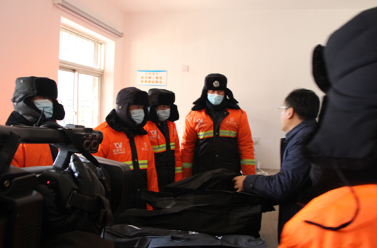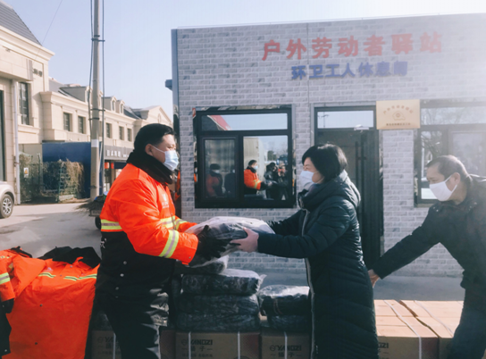 (慰问在蓝鳌路劳动者驿站避寒的一线环卫职工,现场赠送了御寒棉衣)