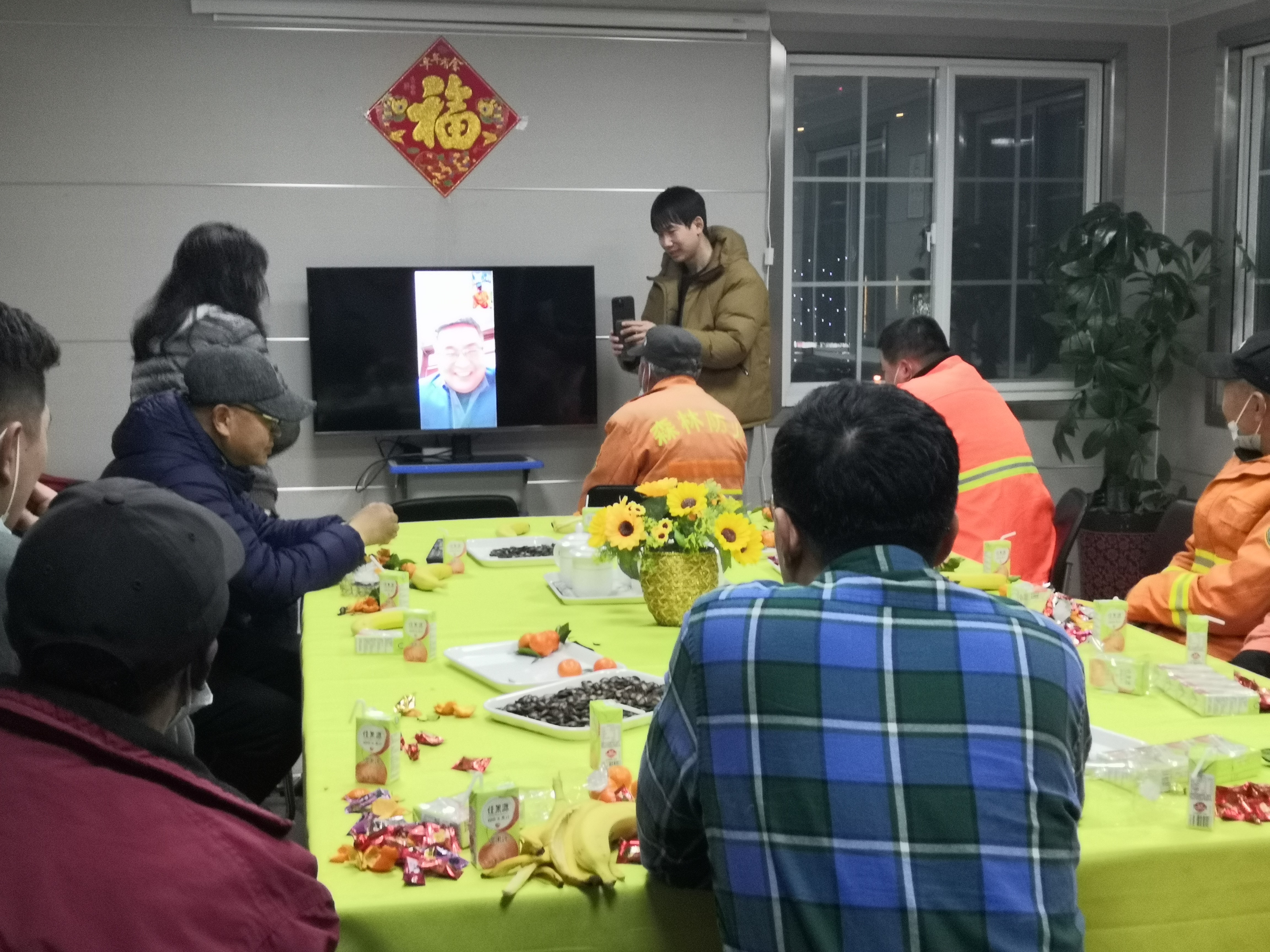 绿化一公司班子成员、相关科室在大年三十与留岗人员一起过年,大家欢聚一堂吃年夜饭、开茶话会、看春节文艺晚会,让留岗人员感受到春节的氛围,保障其温暖过节。