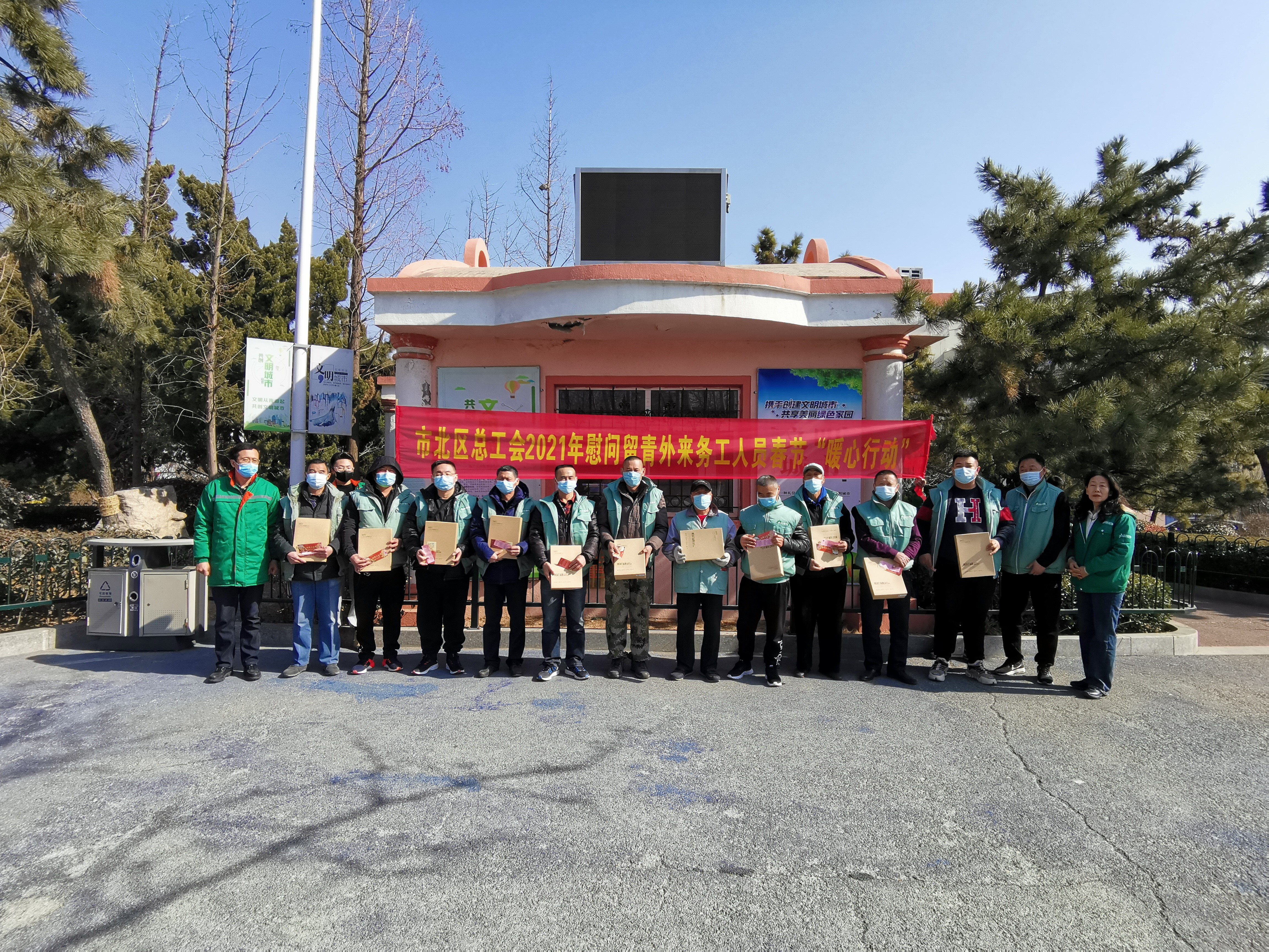 2021年新春佳节,市北区城管局绿化一公司党支部根据市北区工会要求,组织开展“暖心春节 关爱留岗人员”活动,和留岗人员一起过年,为一线工作者送去真情温暖,把新春祝福送到心中,全力做好春节期间稳岗留工工作。