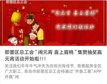 为庆祝元宵佳节,加强对职工的党史教育,普惠服务全区广大职工,即墨区总工会从正月初八开始,通过“齐鲁工惠·青岛行”APP开展了“闹元宵喜上眉梢”线上有奖猜灯谜活动,得到全区广大职工的热烈欢迎和积极参与。
