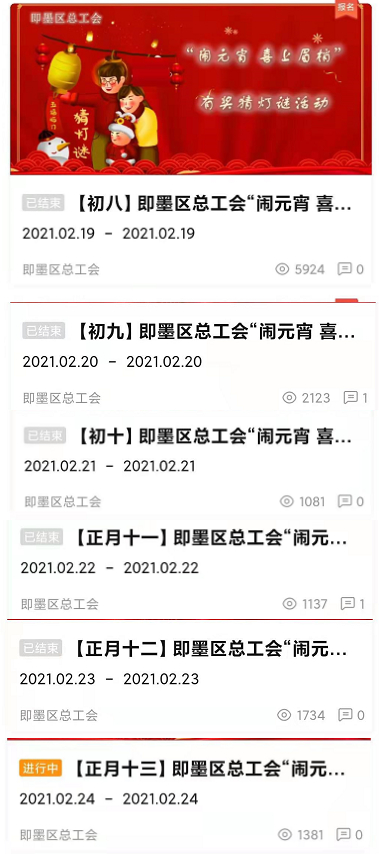 此次活动为期6天,从正月初八开始,一直持续到正月十三,即墨区总工会设置了600盒品牌元宵作为猜灯谜抽奖活动奖品,每天推出100盒。活动设置的灯谜,每天更换,除了传统灯谜之外,还将党史知识、党的十九大和十九届四中、五中全会精神纳入其中,使参与活动职工在娱乐的同时,也能受到党史教育,学习到党中央会议精神。为提高职工的参与率,即墨区总工会通过“即墨工会”微信公众号发布活动信息,并通过全区工会工作微信群,要求各级工会组织下属工会和广大职工积极参与。在为期6天的活动时间里,共有1.5万人次的职工参与到活动中,活动取得圆满成功。