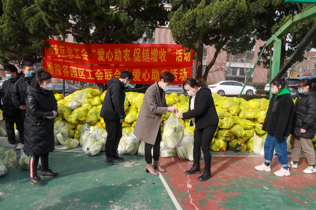 近日,青岛市农村农业局、市商务局等8部门联合组织开展了“爱心助农 促销增收”活动,化解冬季农产品销售难题。市北区总工会第一时间响应,广泛动员全区工会组织和爱心企业伸出援手,与产地农户对接,参加助农活动。12月13日上午,首批助农大白菜发放活动在橡胶谷园区举行。