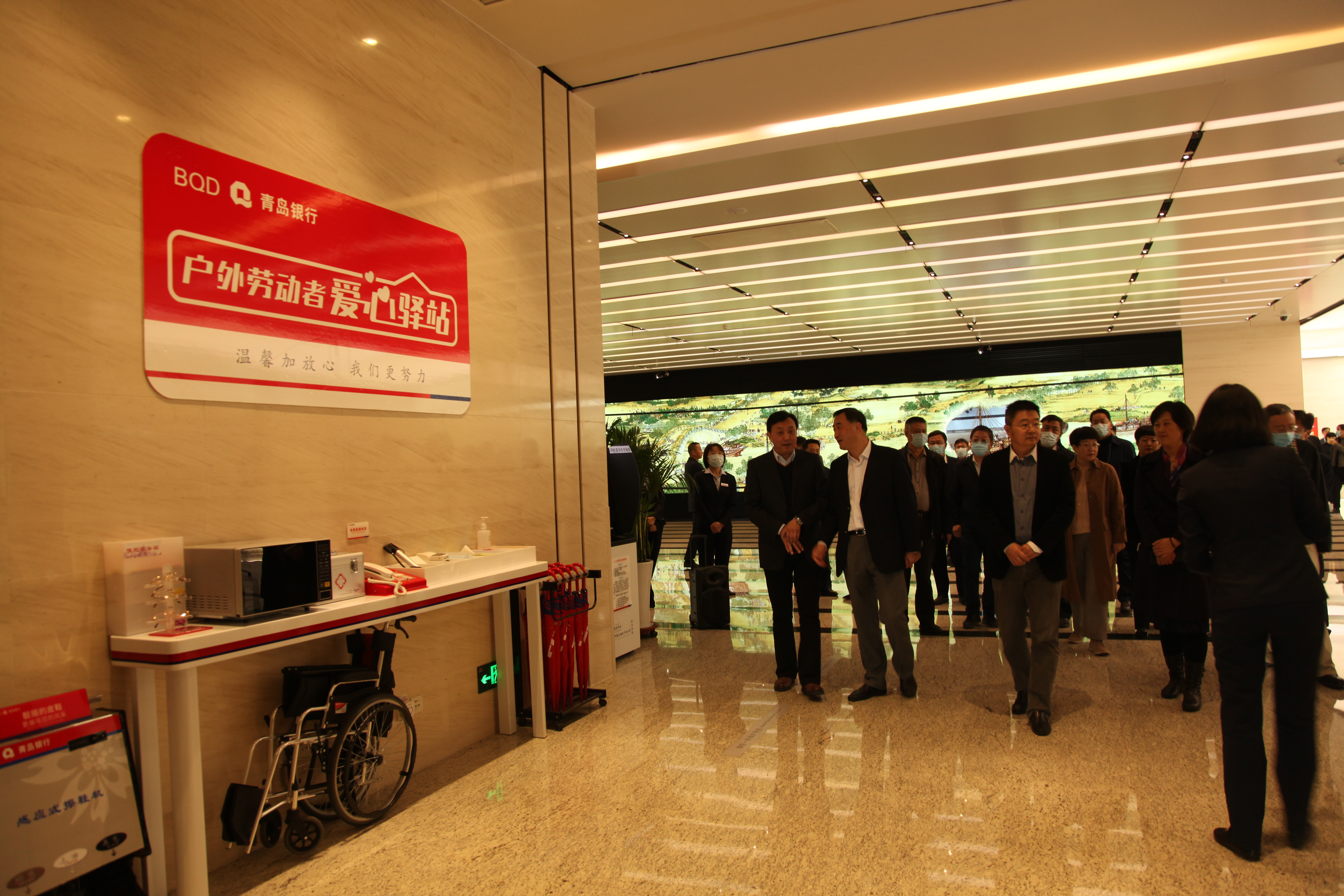 观摩青岛银行总行营业部户外劳动者驿站