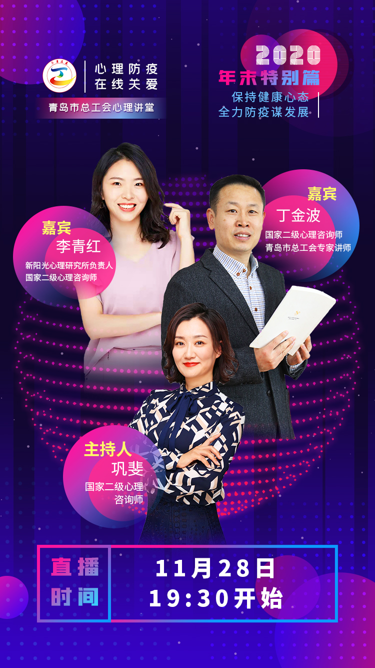 职工朋友们,可登陆“齐鲁工惠·青岛行”APP,第一步:点击界面中间位置的“心理关爱”版块,第二步:点击“公益课堂”活动版块,观看精彩直播内容。