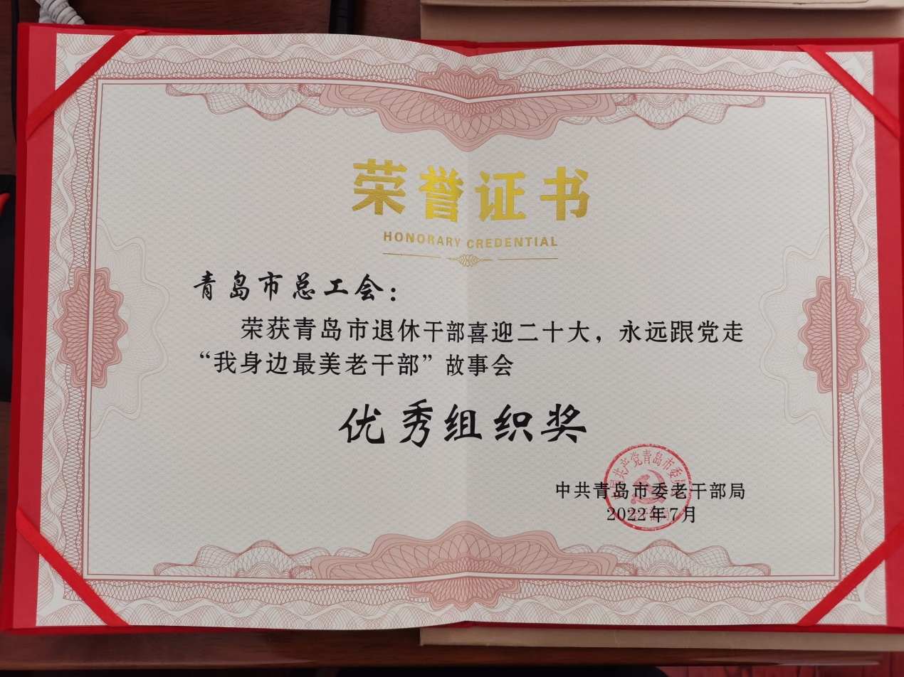 7月15日上午,市总工会推荐的湛山疗养院退休干部许青丽讲述的故事“一份特殊的党费”, 在市委老干部局举行的喜迎二十大,永远跟党走“我身边最美老干部”故事会上获得一等奖,市总工会获得优秀组织奖。