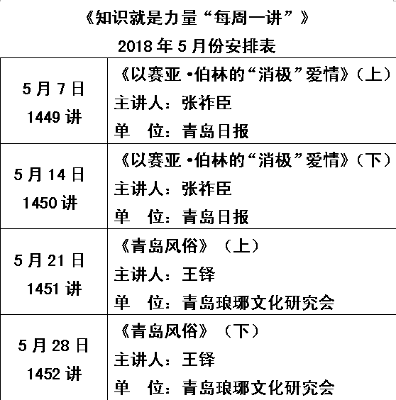 由青岛市总工会主办、青岛市职工文体事业发展中心(青岛市工人文化宫)承办的《知识就是力量“每周一讲”》第1449讲、1450讲定于5月7日、5月14日分别举行(应广大听众需求,2018年“每周一讲”尝试开设系列专题讲座,努力实现每个讲题深入、透彻的呈现给广大听众)。讲座将邀请到《青岛日报》编辑、作家张祚臣老师主讲《以赛亚·伯林的“消极”爱情》(上)、(下)。