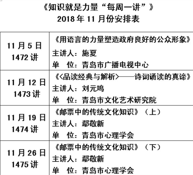 “每周一讲”第1474、1475讲分别定于11月19日、11月26日举行。讲座邀请到青岛市心理学会鄢敬新老师为我们带来《邮票中的传统文化知识》(上)、(下)。