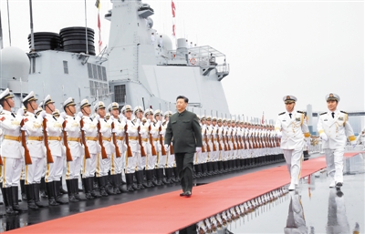 4月23日,在中国人民解放军海军70华诞之际,中共中央总书记、国家主席、中央军委主席习近平出席在青岛举行的庆祝人民海军成立70周年海上阅兵活动。图为习近平检阅海军仪仗队。 新华社照片