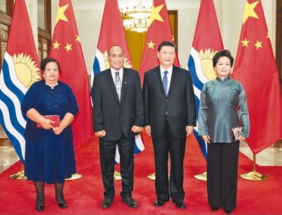 一月六日,国家主席习近平在北京人民大会堂同基里巴斯总统马茂会谈。这是会谈前,习近平和夫人彭丽媛同马茂总统夫妇合影。 |