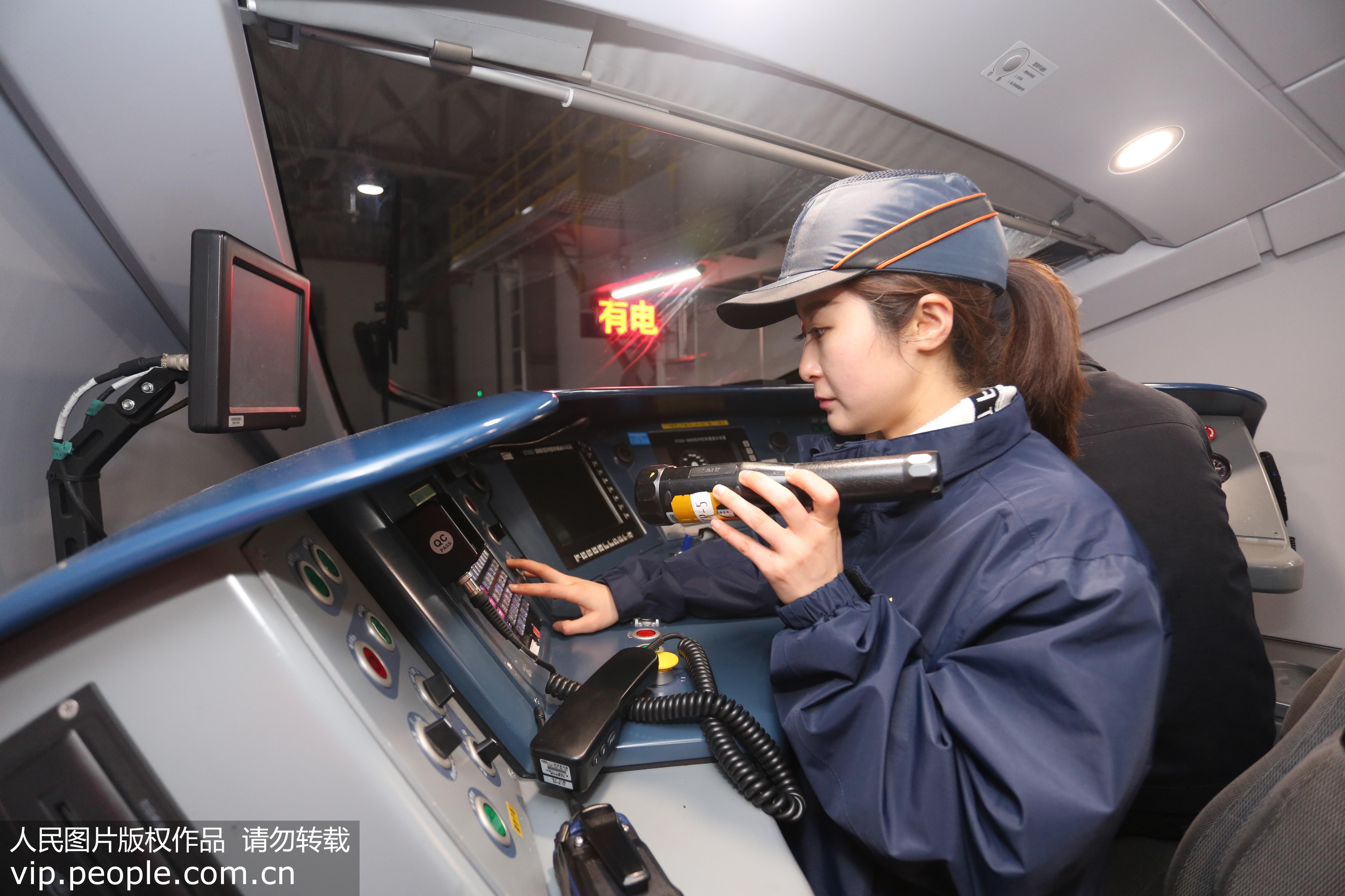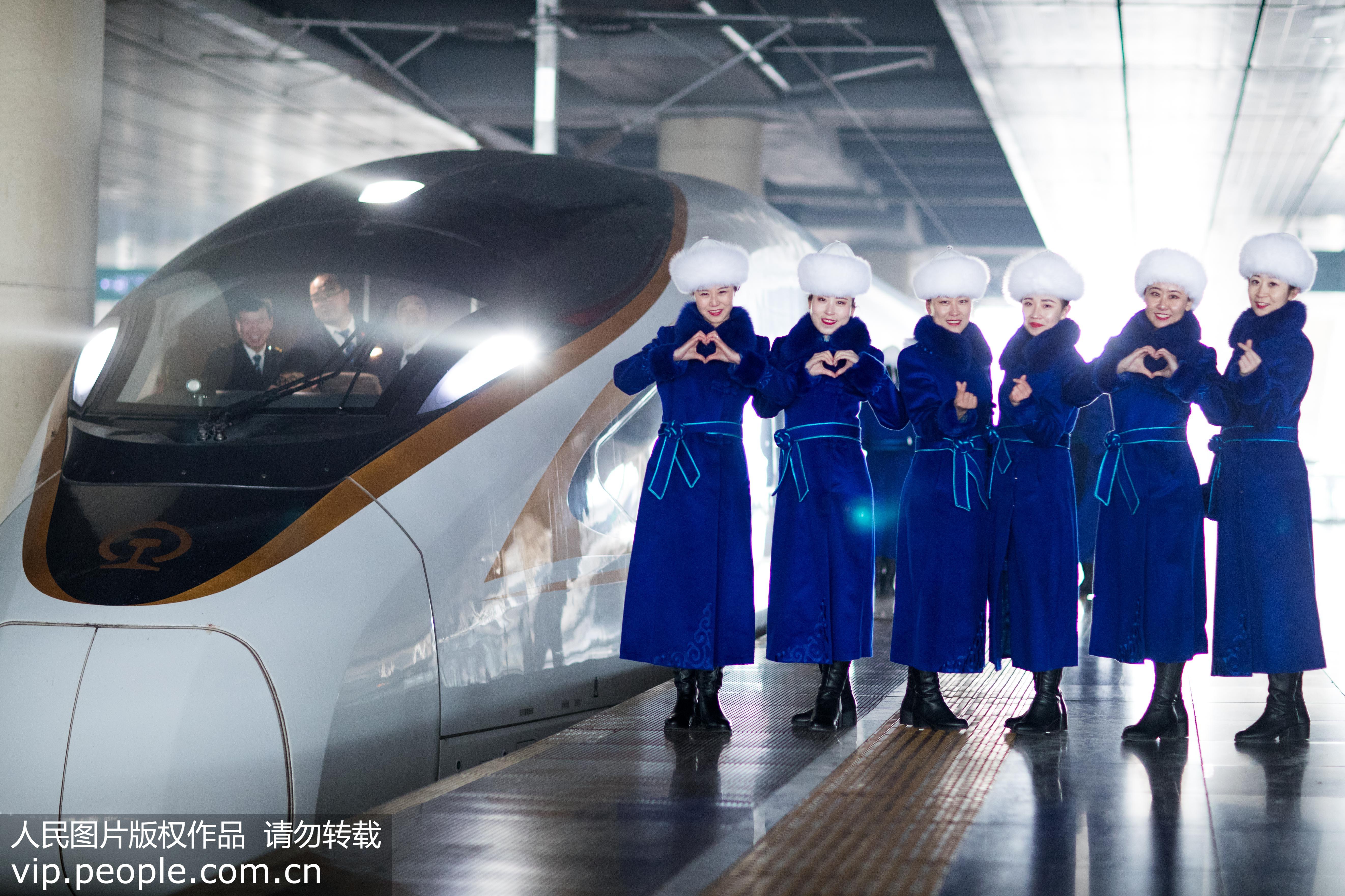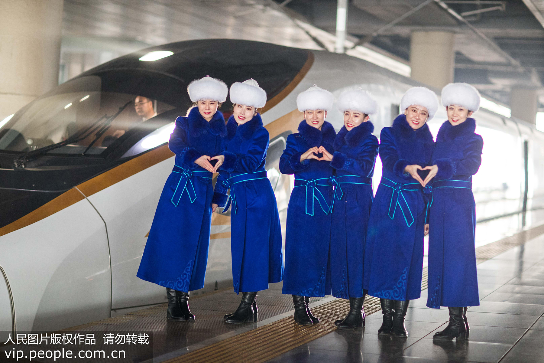 2020年春运京张高铁即将迎来首秀,中铁呼和浩特局包头客运段动车队组织乘务员,从职业礼仪、客运业务、服务技能、应急处置等方面,切实提升列车员服务水平。唐哲/人民图片