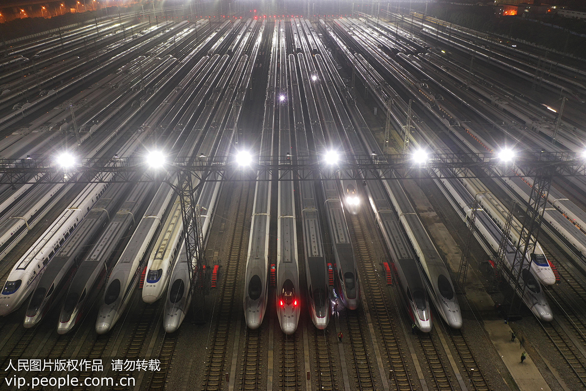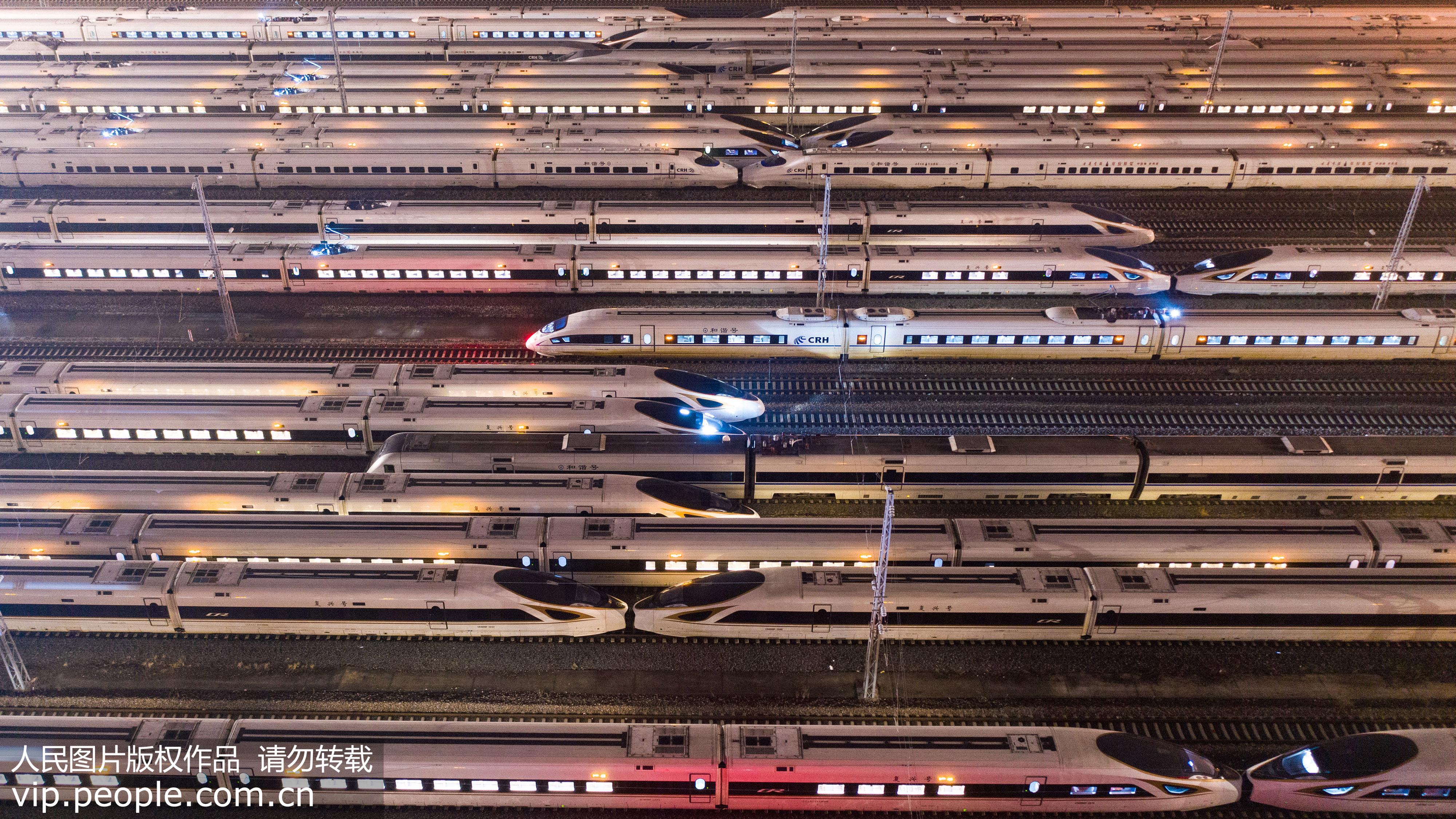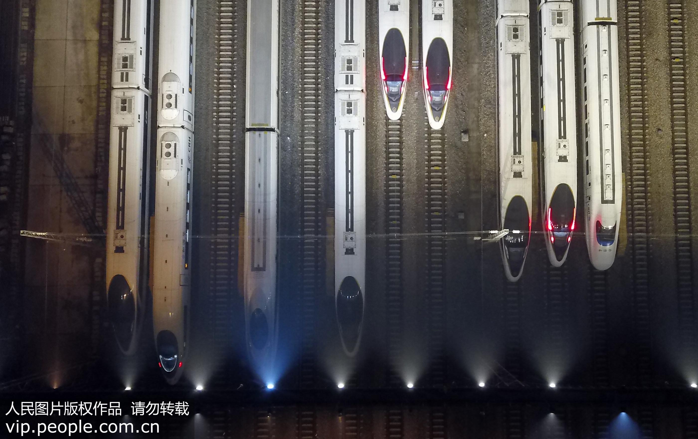 1月10日凌晨,停靠在武汉动车段的动车组列车蓄势待发。当日,2020年春运正式启动。彭琦/人民图片