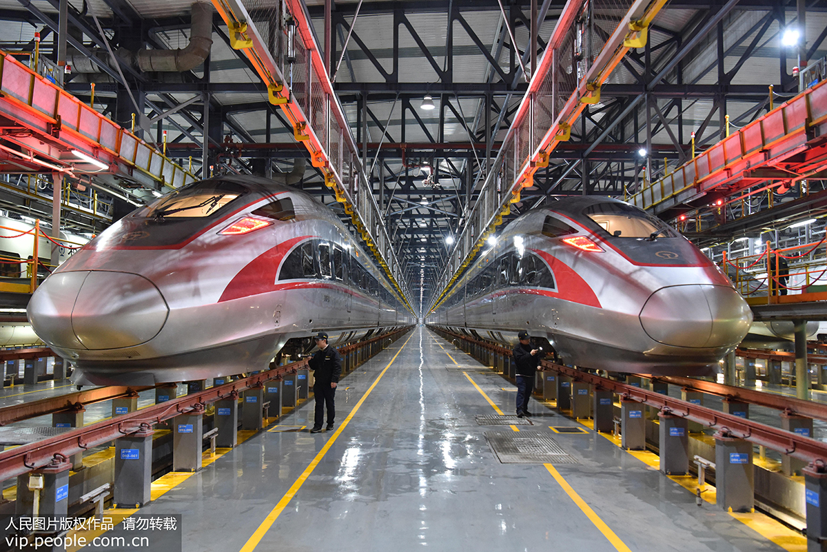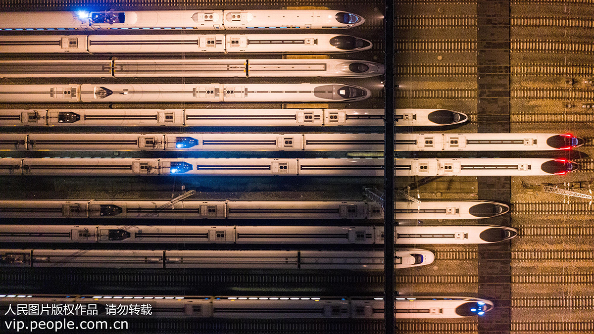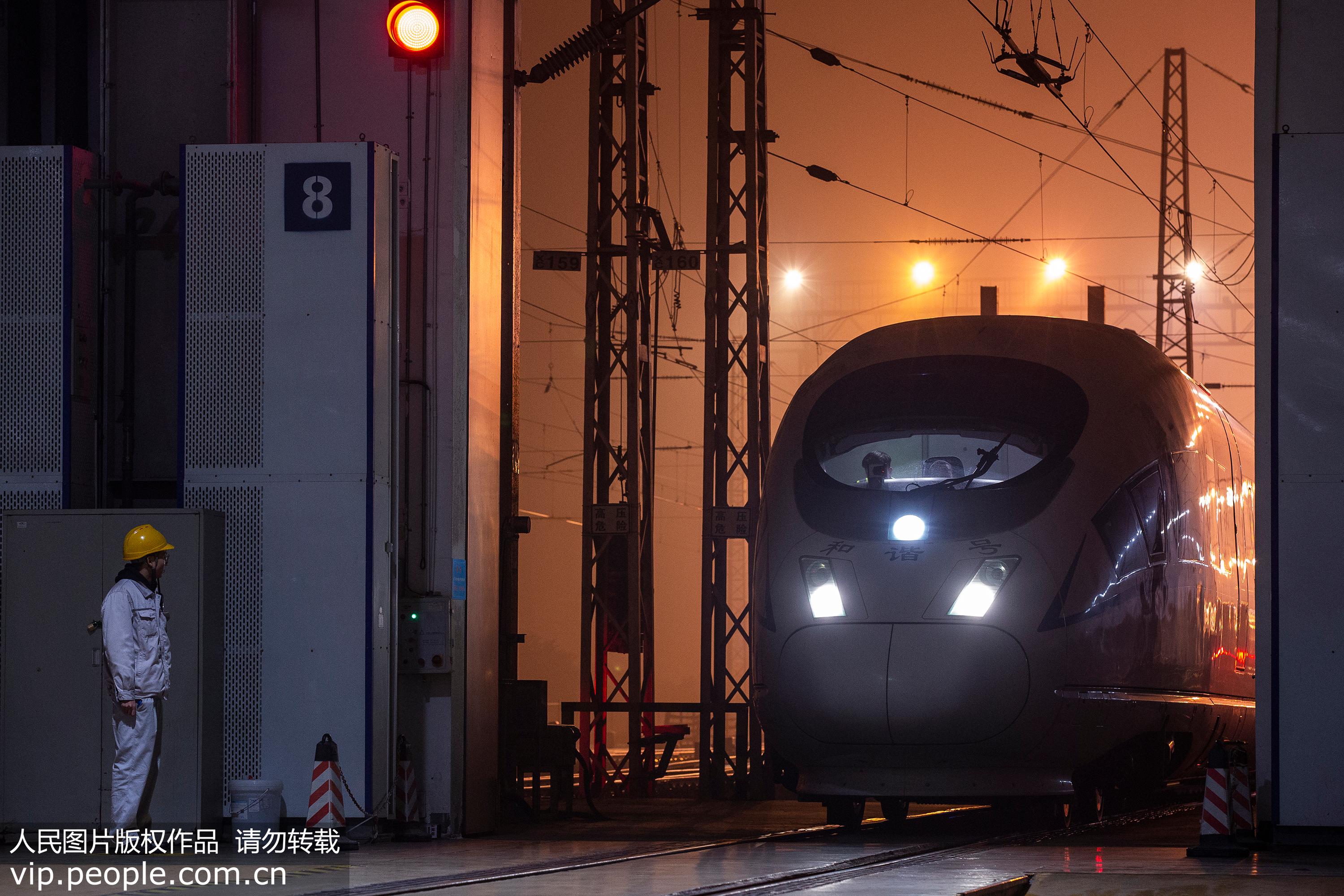 1月10日凌晨,停靠在武汉动车段的动车组列车蓄势待发。当日,2020年春运正式启动。彭琦/人民图片
