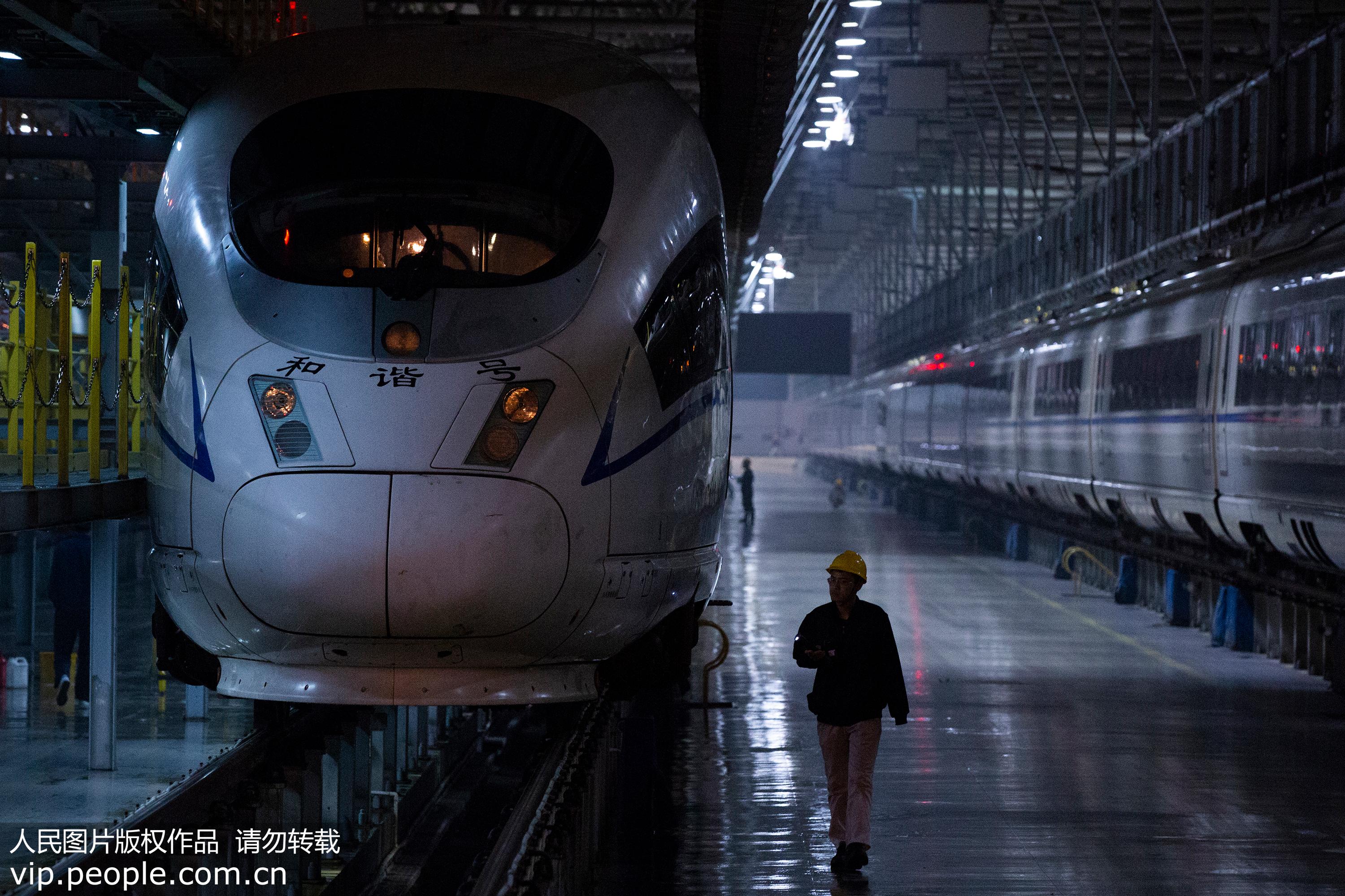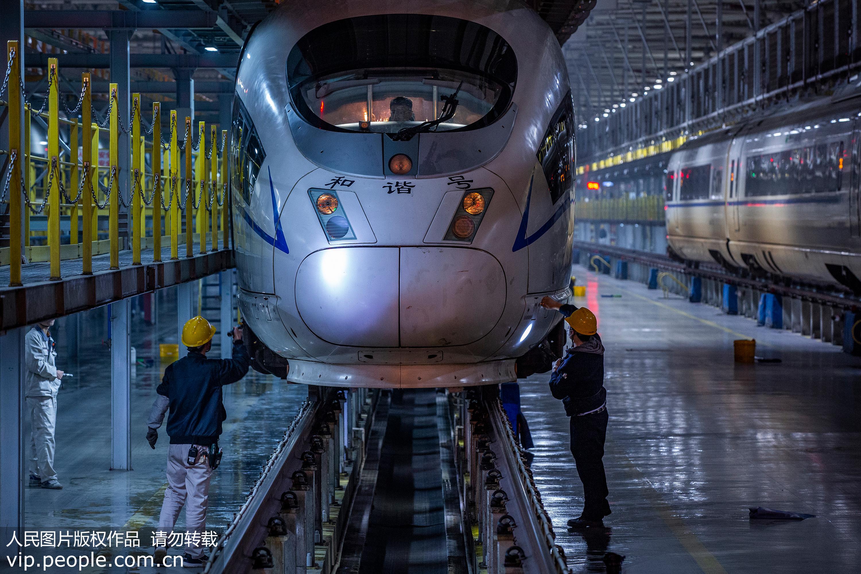 1月9日晚,中国铁路成都局集团有限公司贵阳车辆段贵阳北动车运用所内灯火通明,贵阳北动车运用所员工值守夜间,对动车组进行检修维护,迎接2020年春运。2020年春运即将于1月10日正式拉开序幕。张晖/人民图片