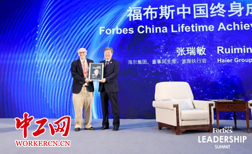 中工网讯 10月19日,在山东青岛举行的2019福布斯中国领导力论坛大会现场,海尔集团董事局主席、首席执行官张瑞敏被授予“福布斯中国终身成就奖”,以表彰他数十年如一日坚持企业家精神,锲而不舍地倡导创新精神,带领海尔集团在全球化背景下达成的辉煌成就。