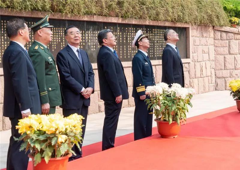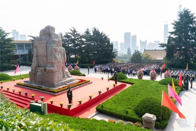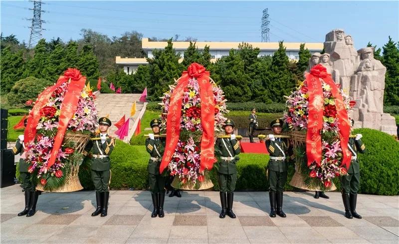 仪式在雄壮的国歌声中开始,全体参祭人员手持鲜花,肃立在烈士群雕前默哀致敬,深情缅怀为新中国解放事业献出宝贵生命的烈士们。