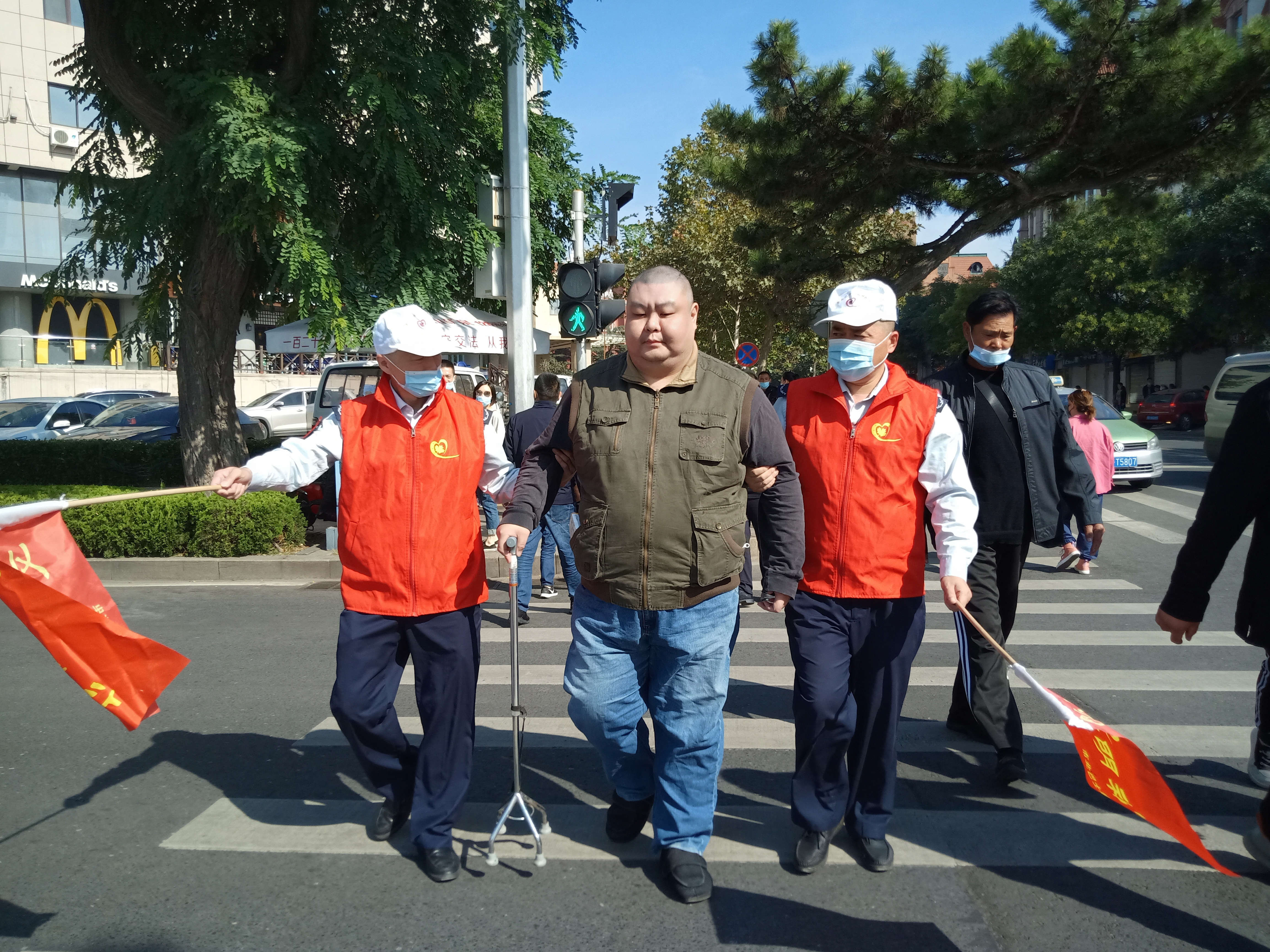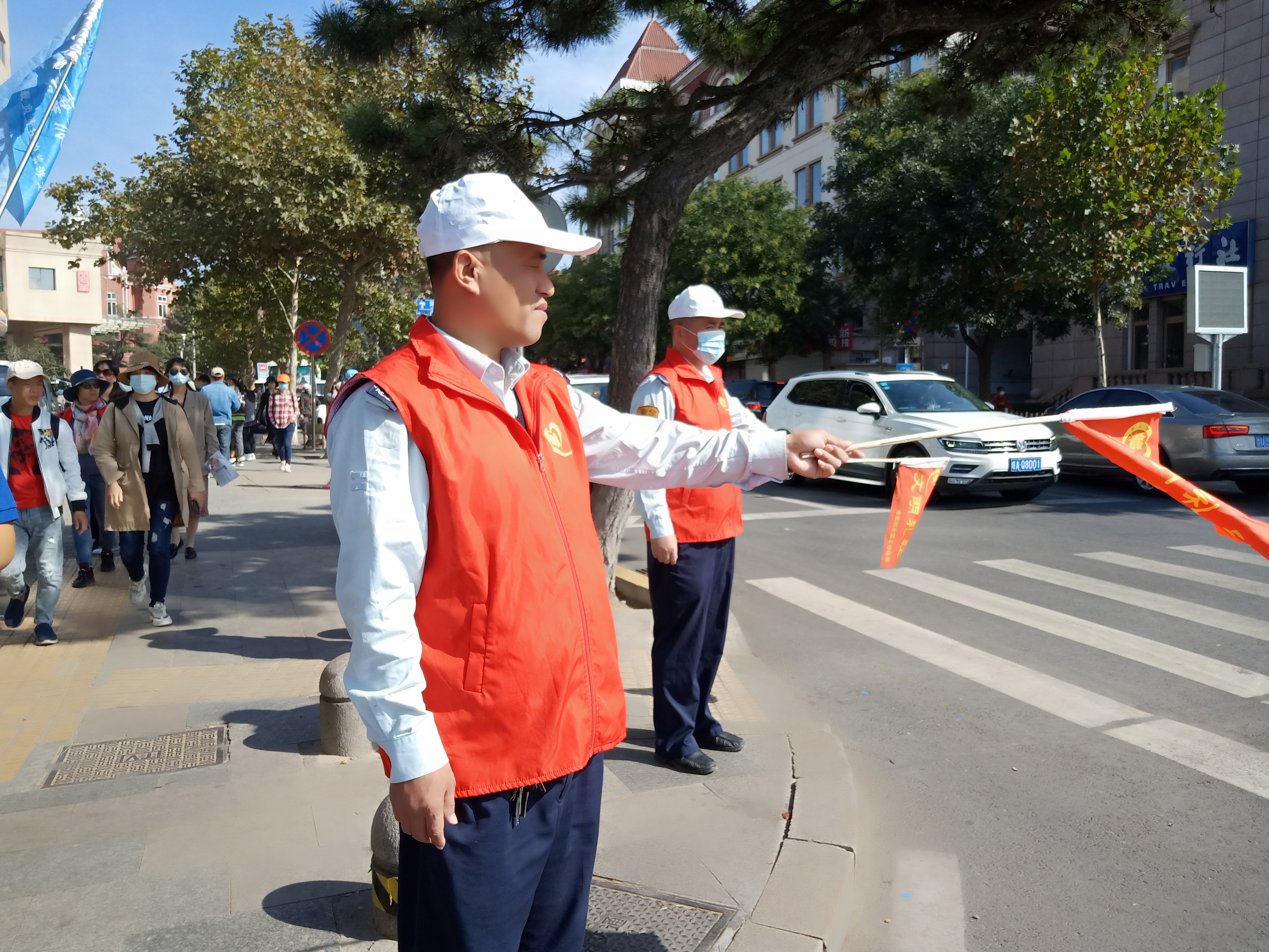 10月6日一大早,在栈桥附近的公交站台上,五名志愿者又开始了一天的志愿服务活动。一位拖着行李箱的游客正向志愿者问路,志愿者为他热情指路,并详细告知他具体的出行方向,还有三名志愿者挥舞着引导旗,在没有信号灯的斑马线前有序引导市民过马路。