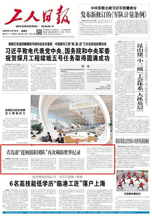 12月17日,山东港口集团青岛港全自动化集装箱码头“连钢创新团队”再创佳绩:在107#泊位“德翔普南”轮作业中,桥吊单机作业效率达到47.6自然箱/小时,第6次刷新自动化码头装卸世界纪录。