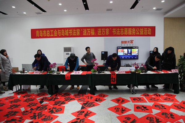 活动现场岛城著名书法家们大显身手,挥毫泼墨、龙飞凤舞,现场创作撰写几百张春联和福字,全部赠送给到场的200多名一线职工和困难职工。李皓、姜岱积、周新国、刘健出席活动并现场书写“福”字和春联。通过写春联、送祝福这种体现民族特色和民俗习惯的活动,继承优秀传统文化,营造欢乐、祥和的新春节日氛围,给一线职工和困难家庭带去了传统的精神文化盛宴。