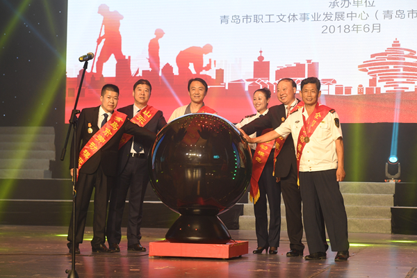 随后,王炳交、皮进军、王艳、郭锐、梁刚、张家鹏6名全国、省、市劳模代表一起上台,随着主持人的倒计时一起按下水晶球,共同开启“青岛市首届职工文化艺术节”。开幕仪式结束后,大家共同欣赏了由市工人文化宫艺术工作者朱积敏总导演的精彩文艺演出。