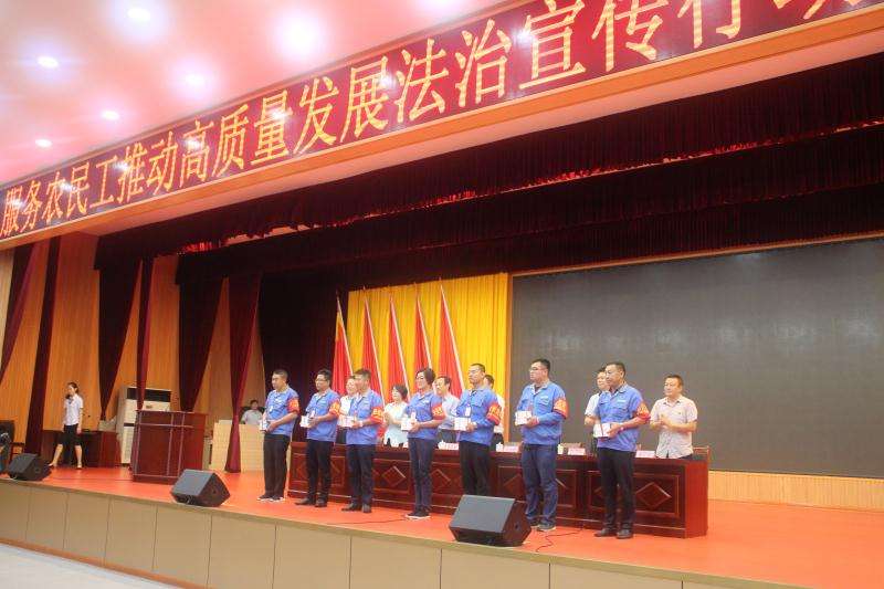 据了解,“尊法守法•携手筑梦”服务农民工推动高质量发展法治宣传行动由市总工会举办,是进一步做好我市新形势下农民工法治宣传工作的重要举措,活动以大学生志愿者深入我市农民工集中的区市、企业,开展政策法规宣讲、法律咨询服务、文艺演出等为主要形式,目的是进一步提高农民工法治意识,依法依规理性表达利益诉求,自觉维护社会和谐稳定。启动仪式上,各位领导向参与服务农民工法治宣传行动的中国海洋大学服务分队志愿者代表授予队旗,向农民工代表赠送了《服务农民工法治宣传工作手册》,志愿者代表和农民工代表进行了表态发言。