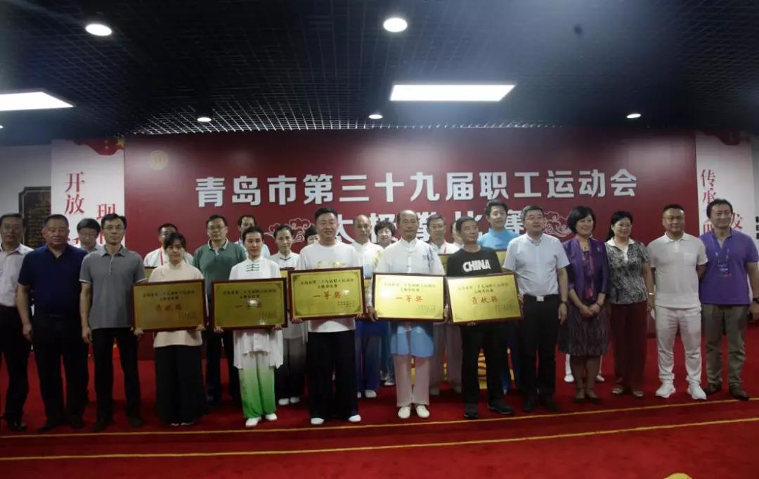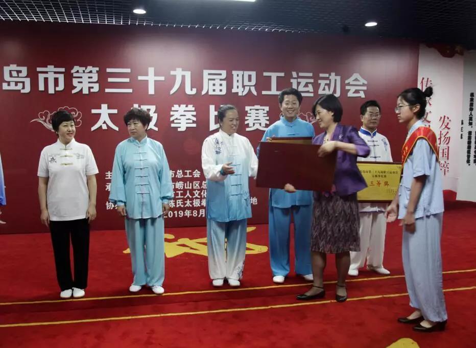 8月17日,由青岛市总工会和青岛市体育局主办、崂山区总工会和青岛市工人文化宫承办、青岛陈氏太极拳国际培训基地协办的青岛市第三十九届职工运动会太极拳比赛在青岛陈氏太极拳国际培训基地隆重举行。市总工会党组书记、常务副主席彭建国,市总工会党组成员、副主席李丽,崂山区人大副主任、区总工会主席宋军,青岛市工人文化宫党委书记、主任尹常忠出席比赛活动并为获奖代表队颁奖。来自全市各行各业13个代表队的286名职工选手参加了比赛。