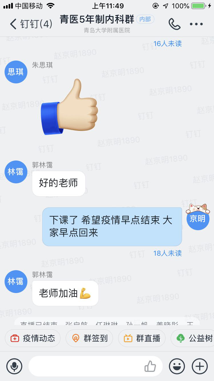 因为疫情防控原因,目前各大院校不能进行集中课堂教学,响应青岛大学“停课不停教”的号召,又因为身在武汉救援,不想耽误学生学习的赵京明便利用休息时间给自己的学生上网课。