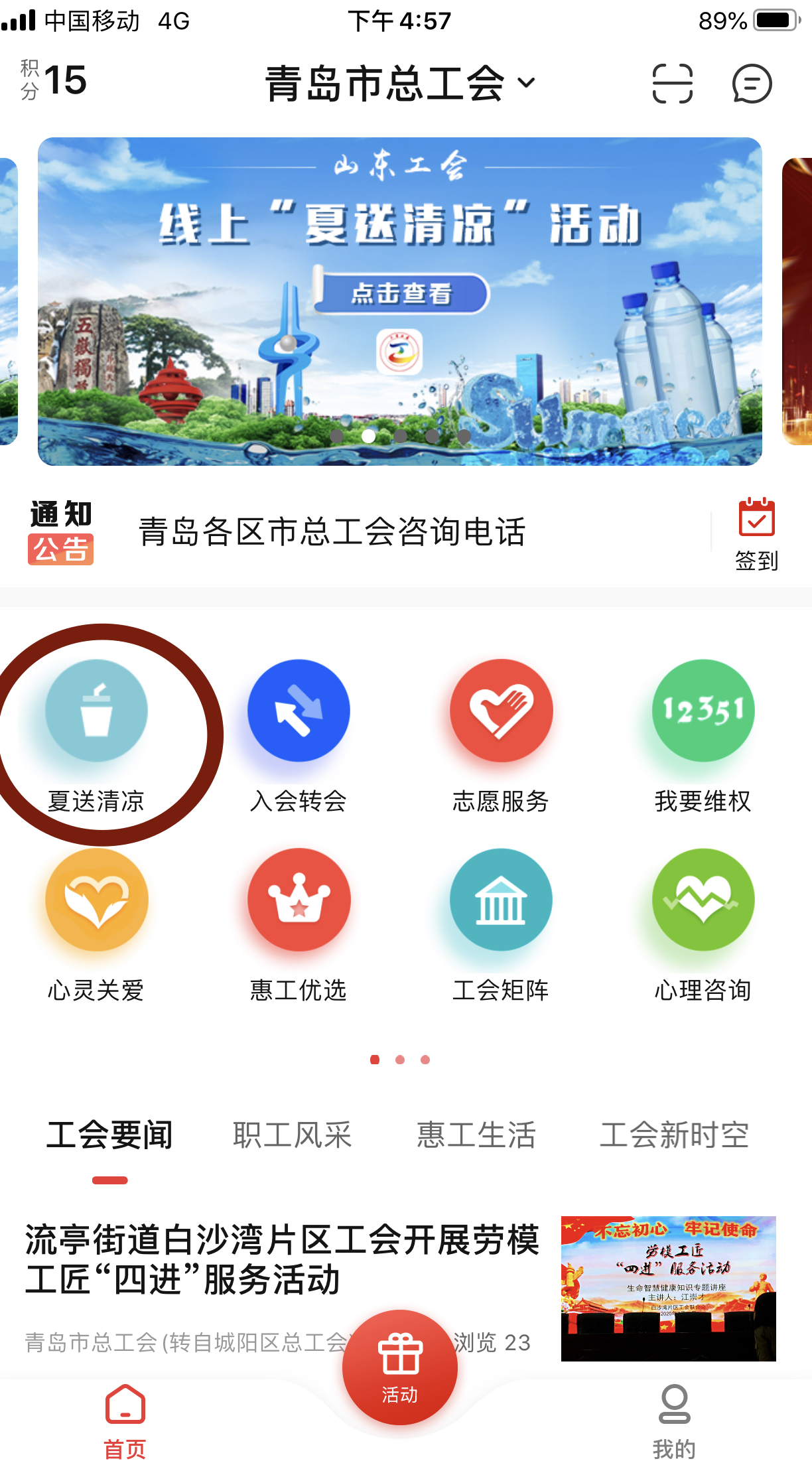 打开“齐鲁工惠”APP首页,点击“夏送清凉”功能按钮(如下图所示)。