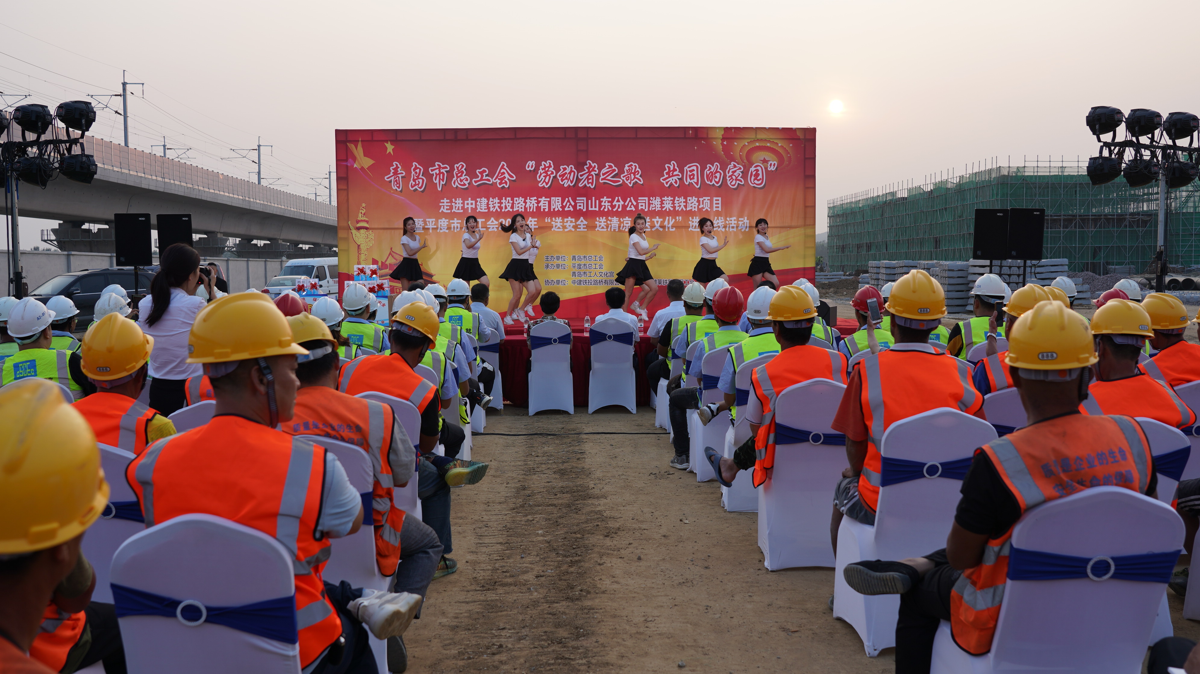 近日,由青岛市总工会主办,平度市总工会、青岛市工人文化宫承办,中建铁投路桥有限公司山东分公司潍莱铁路项目工会协办的“劳动者之歌·共同的家园”走进中建铁投路桥有限公司山东分公司慰问演出活动在潍莱铁路项目施工现场开演。现场平度市总工会的领导们为职工代表发放安全生产知识书籍和送清凉慰问物品。中建铁投路桥有限公司山东分公司上百名职工现场观看演出。