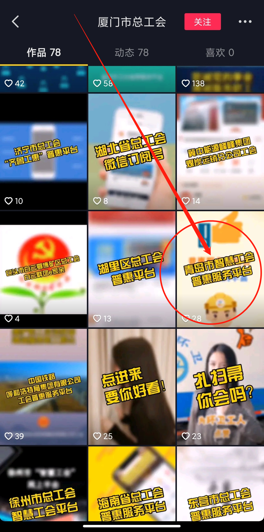 1、保存下图到相册(打开抖音立即看到)或搜索厦门市总工会抖音号,进入视频主页查找“青岛市智慧工会普惠服务平台 ”内容,点赞、评论、转发!