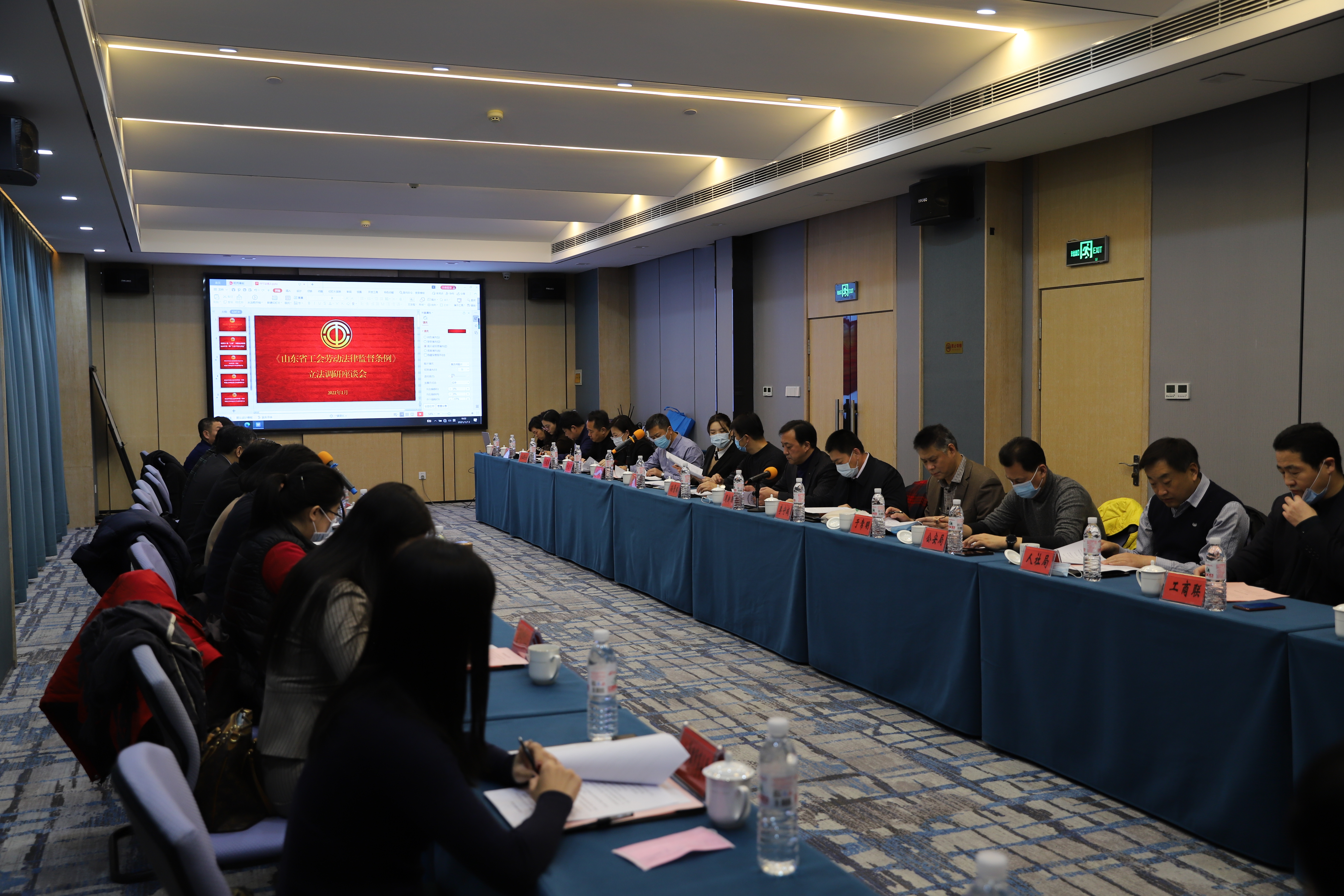2021年1月13日,山东省人大常委会法制工作委员会副主任王仲泉、省总工会党组成员、副主席王际仓等一行七人赴青岛市总工会开展《山东省工会劳动法律监督条例》立法调研。青岛市总工会党组成员、副主席周新国,市人大常委会法制工作室负责同志等陪同调研。