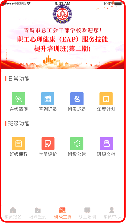 “班级主页”板块设计了“日常功能”和“班级功能”,学员可以通过“日常功能”完成在线请假,查看班级成员和年度培训计划等;通过“班级功能”查看课程安排、班级公告、班级文档等,既为参训学员提供了信息交流和共享平台,也切实提升了班级事务性管理效能。