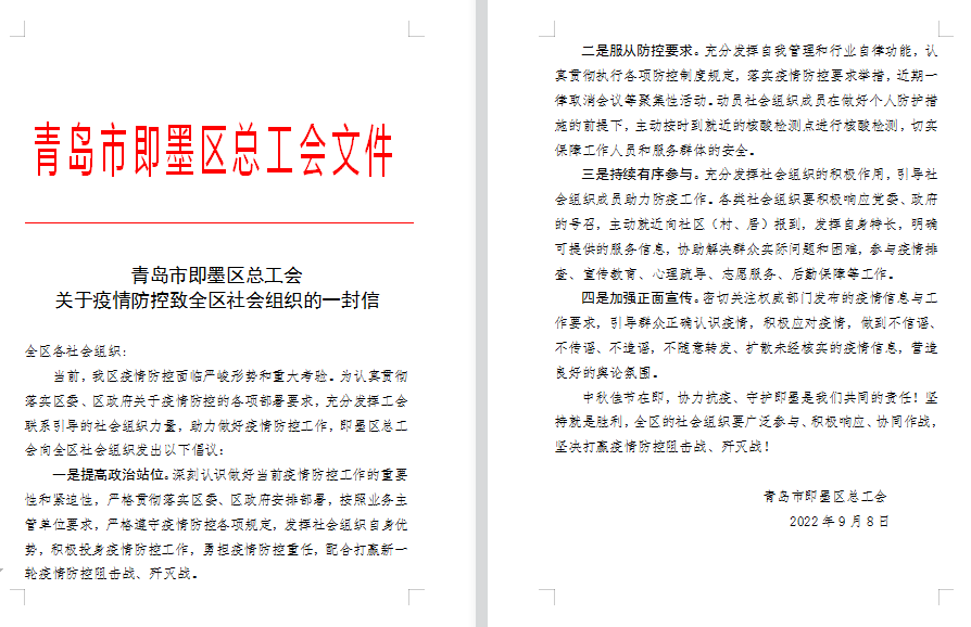 即墨区总工会号召全区12000余名工会志愿者做科学防疫的践行者和维护者,号召广大社会组织严格遵守疫情防控各项规定,发挥自身优势积极投身疫情防控工作,勇担疫情防控重任。