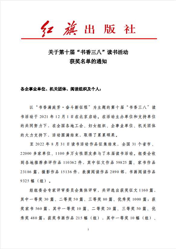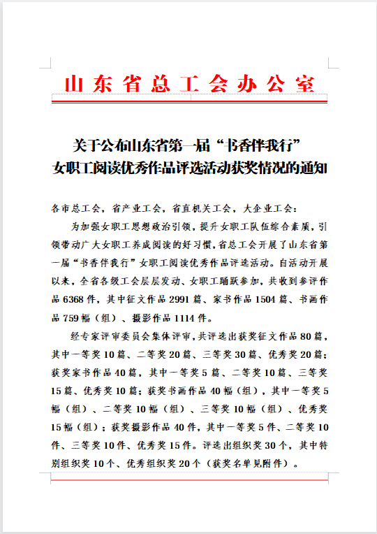 近日,“书香三八”官网发布全国第十届“书香三八”读书活动获奖名单,在全国2.2万家参与单位中,青岛市总工会被授予全国“书香三八”读书活动优秀组织奖,这已经是市总工会连续三年获得该项荣誉。与此同时,山东省总工会举办第一届“书香伴我行”女职工阅读优秀作品评选活动,青岛市总工会荣获特别组织奖。