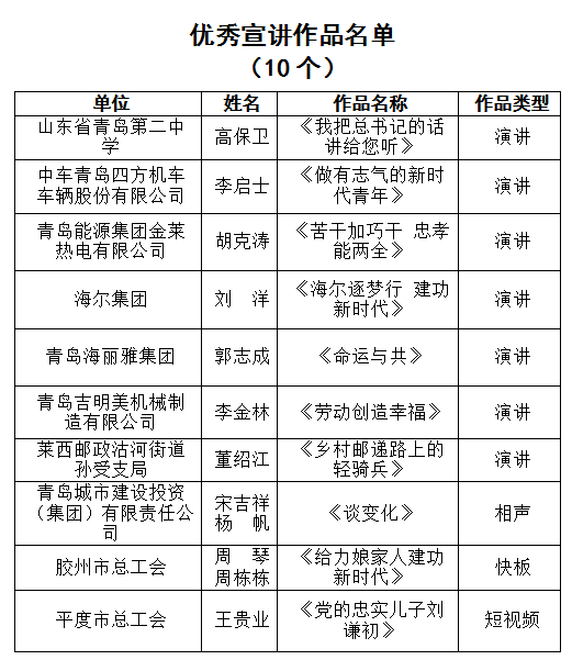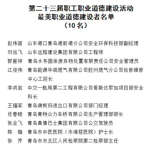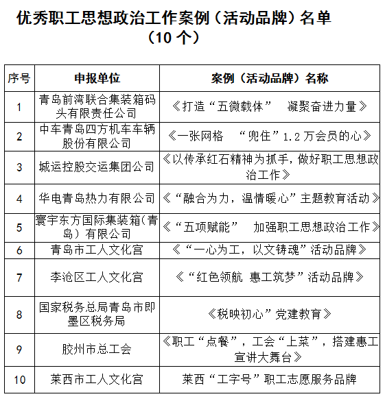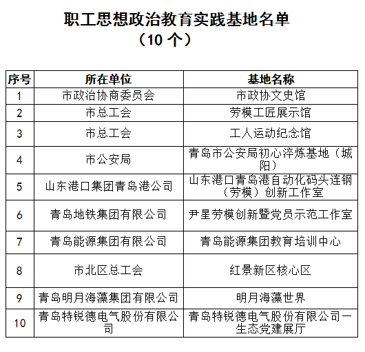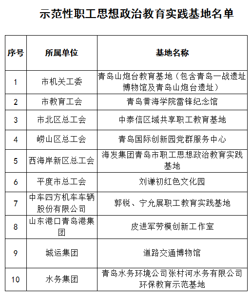 为进一步听取群众意见,接受社会监督,现将职工思想政治教育实践基地、职工思想政治工作优秀案例以及职工职业道德建设和宣讲阅读活动先进单位(个人)名单予以公示,如对公示的人选有异议者,请在3个工作日内向青岛市总工会宣教网络部反映(实名反映问题)。