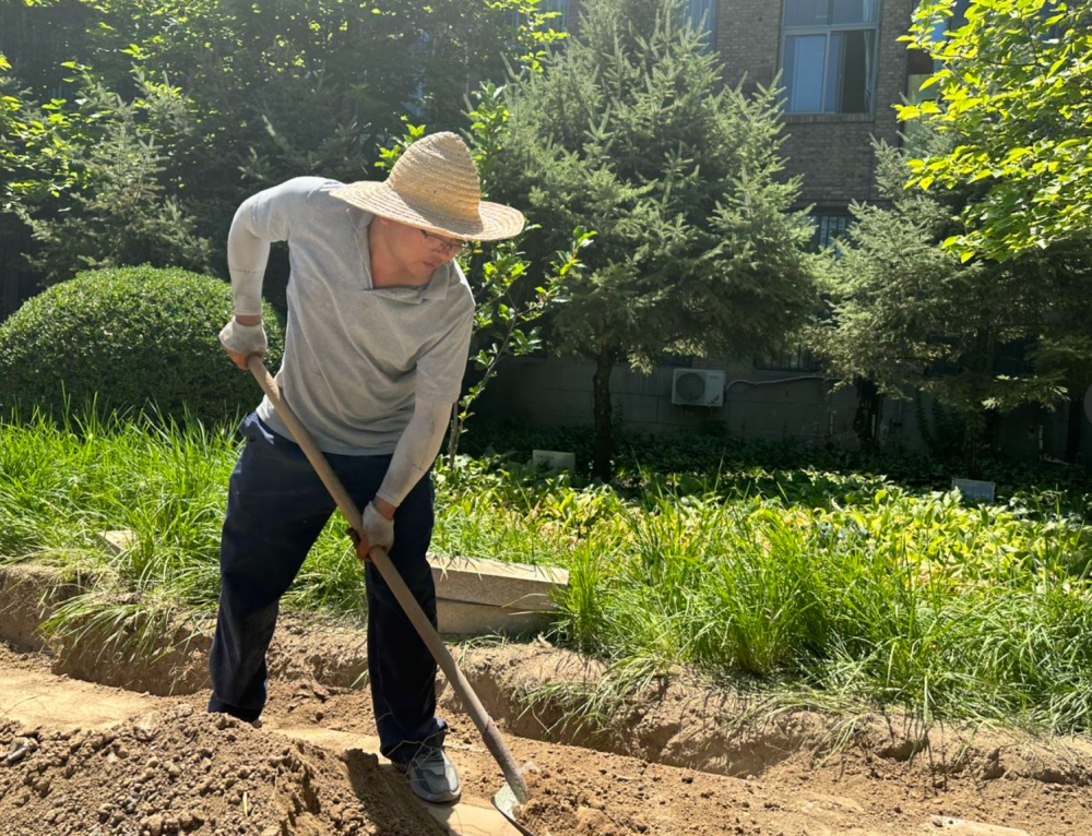 ↑7月8日,中国农业大学东校区后勤保障处水电暖管理中心职工武海宁正在进行电缆沟回填作业,为抢工期,职工们已经在高温下连续奋战了十几天。(中国农业大学新闻中心 刘铮 摄)