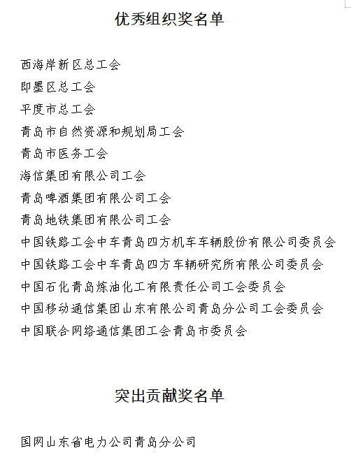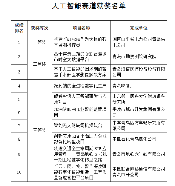 日前,决赛获奖名单予以公布。来自全市各行业38个单位的77个创新项目报名参赛,最终2个赛道共有20个项目进入决赛。通过现场展示答辩、专家现场评分,人工智能赛道的“构建“AI+RPA”为大脑的数字监测指挥员”等10个项目和5G+工业互联网赛道的“5G+行业应用创新类通信资源深度共享推动5G智能电网建设”等10个项目,分别获得2个赛道的一、二、三等奖;西海岸新区总工会等13家单位获“优秀组织奖”;国网山东省电力公司青岛供电公司获“突出贡献奖”。