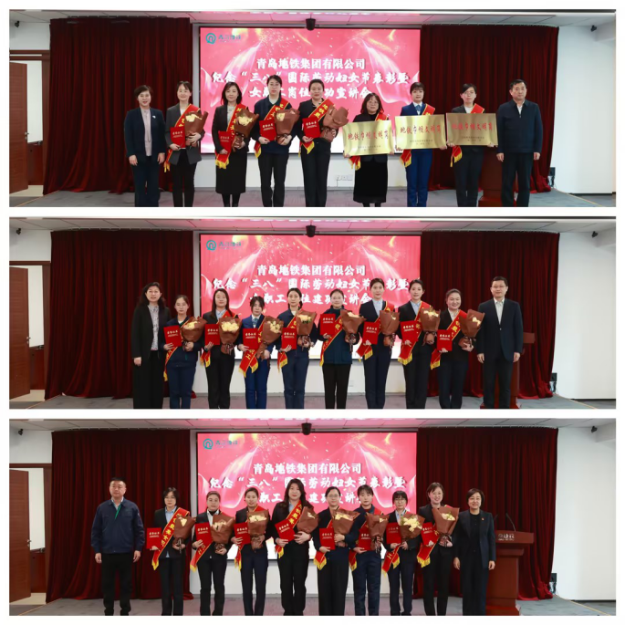 3月8日,青岛地铁集团在应急指挥中心会议室举办“班组建设助发展 地铁巾帼建新功”“三八”国际妇女节表彰暨事迹宣讲会,表扬巾帼典型、学习先进事迹、倡议建功奋进。大会表彰2023年度获得省市级表彰表扬的女性先进个人和集体代表,会上,地铁集团领导向获评省市三八红旗手、三八红旗集体,第六届地铁巾帼文明岗、最美女职工授予了奖牌。