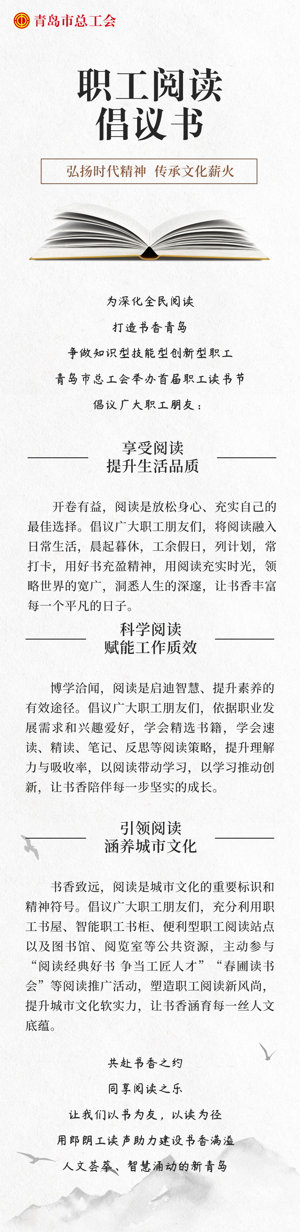全国劳动模范,青岛地铁运营有限公司尹星代表劳模工匠倡议广大职工,享受阅读,提升生活品质;科学阅读,赋能工作质效;引领阅读,涵养城市文化,以阅读带动学习,以学习推动创新。市总工会将以1030个市级职工书屋、128个“智能职工书柜”和“惠工悦读”线上平台为依托,打造阅读品牌、拓展阅读形式、丰富阅读内容,持续推进职工阅读大众化、常态化发展,鼓励广大职工争做知识型、技能型、创新型高素质劳动者,以优异成绩献礼新中国成立75周年。