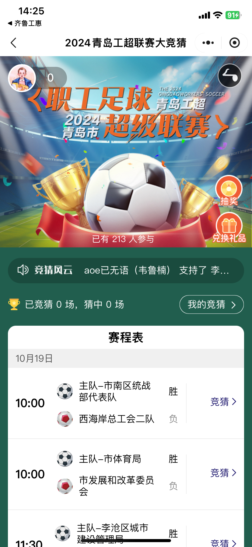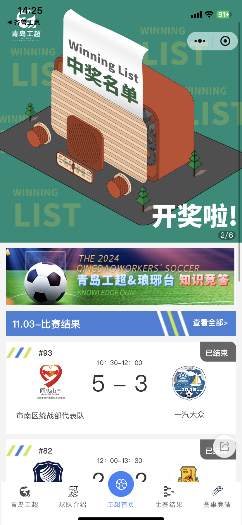 在比赛进行的同时,青岛工超官方小程序“工超联赛”也正式上线,齐鲁工惠APP也同步开设“青岛工超”专栏。该程序不仅让职工能够实时掌握赛事的最新动态,随时随地浏览赛程进度,即时获取比赛结果及积分榜、射手榜、红黄牌榜在内的最新动态,还特别设置了赛事竞猜、线上抽奖等各式各样的精彩活动,广大职工朋友可以通过小程序踊跃参与互动活动赢取丰厚奖品。
