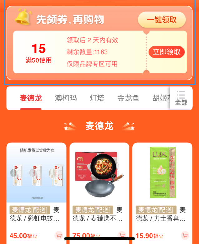 3. 一键领取两张满50减15优惠券,即可在品牌专区下单抵扣!