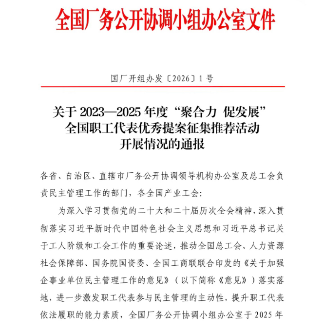 2026年1月26日,全国厂务公开协调小组办公室印发《关于2023—2025年度“聚合力 促发展”全国职工代表优秀提案征集推荐活动开展情况的通报》,由青岛市总工会重点培育并推荐的青岛聚泰城市服务集团有限公司《关于实施“双选模式”激活人才活力 促进企业高质量发展的提案》和即墨区田横岛省级旅游度假区文山小学《关于完善民主管理机制 激发教师主体作用的提案》在征集活动中脱颖而出,获评全国优秀提案图片图片